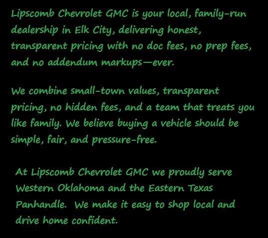 Visit Lipscomb Chevrolet GMC in Elk City, Oklahoma, or contact us today for more information.